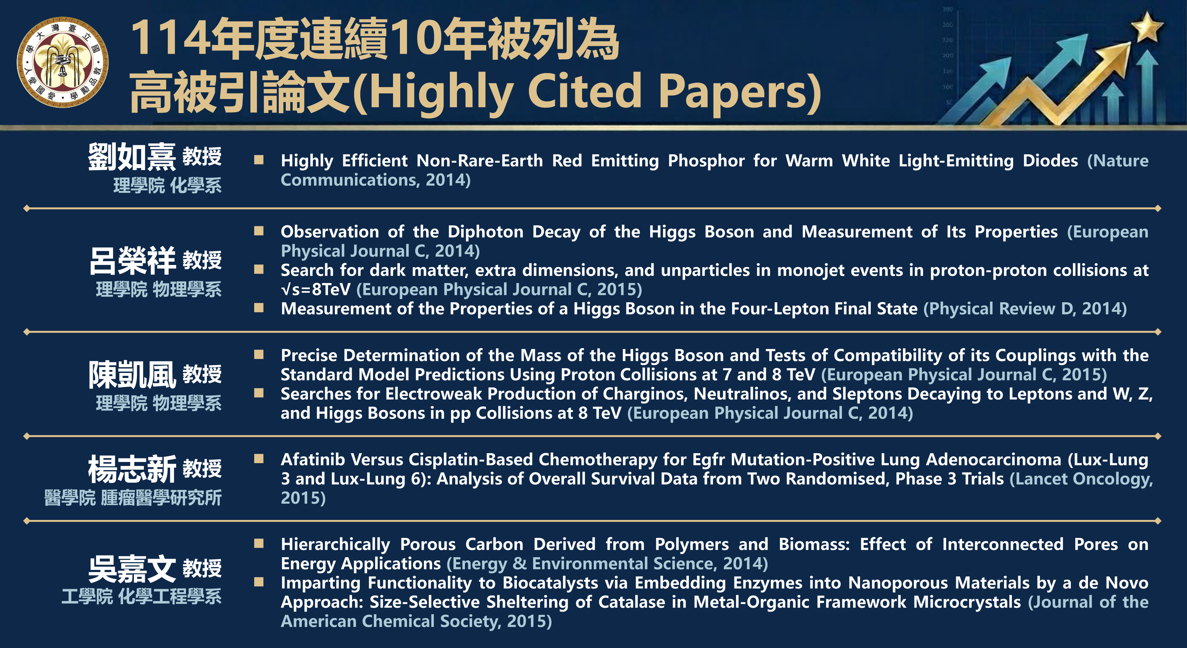 臺灣大學2025年度「連續10年」高度被引用論文共計5位教師(9篇論文):理學院化學系教授劉如熹、物理學系教授呂榮祥、教授陳凱風、醫學院腫瘤醫學研究所教授楊志新、工學院化學工程學系教授吳嘉文,「連續5年」高度被引用論文共計15位教師(25篇論文):理學院化學系教授陳浩銘、教授劉如熹、天文物理研究所教授薛熙于、物理學系教授張寶棣、教授裴思達、醫學院腫瘤醫學研究所教授楊志新、工學院化學工程學系教授吳嘉文、教授闕居振、生物資源暨農學院生物環境系統工程學系教授張斐章、公共衛生學院流行病學與預防醫學研究所教授林先和、電機資訊學院光電工程學研究所教授李君浩、電機工程學系教授吳忠幟、生命科學院生命科學系教授林盈仲、植物科學研究所教授吳克強、凝態科學研究中心副研究員吳恆良。前述教師發表之論文涵蓋多個學門領域,呈現臺大研究影響力之多元面向。