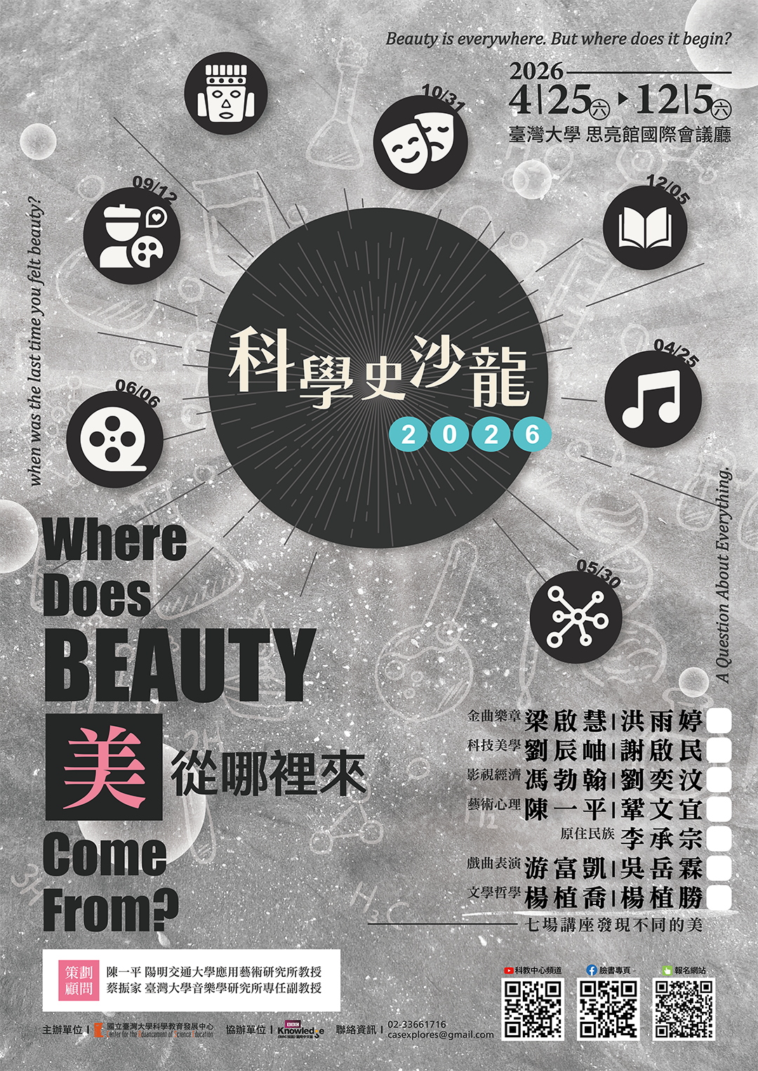 臺灣大學科學教育發展中心(CASE)主辦的「科學史沙龍2026:美從哪裡來」系列講座來囉。這期以「美從哪裡來」作為核心主軸,展開一段跨領域的尋美之旅。從音樂、科技、AI、藝術、戲曲到文學,邀請不同領域的創作者與研究者,一同走進發現美的瞬間。