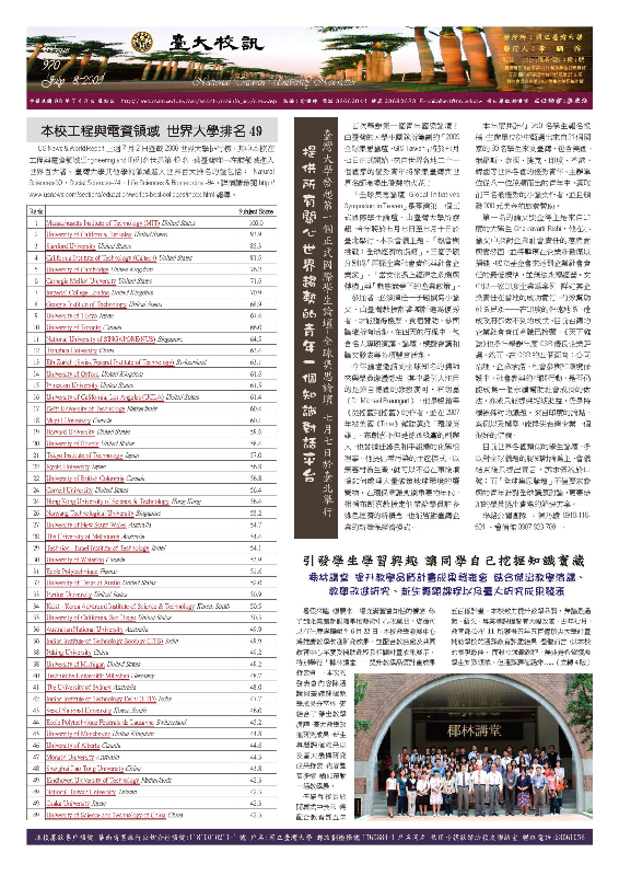 US News & World Report上週7月2日登載2008世界大學排行榜,其中本校在工 程與電資領域(Engineering and IT)列名世界第49名,為臺灣唯一在該領域進 入世界百大者。臺灣大學其他學術領域進入世界百大排名的還包括:Natural Sciences-50,Social Sciences-74,Life Sciences & Biomedicine -84。 詳情請參閱http://www.u...